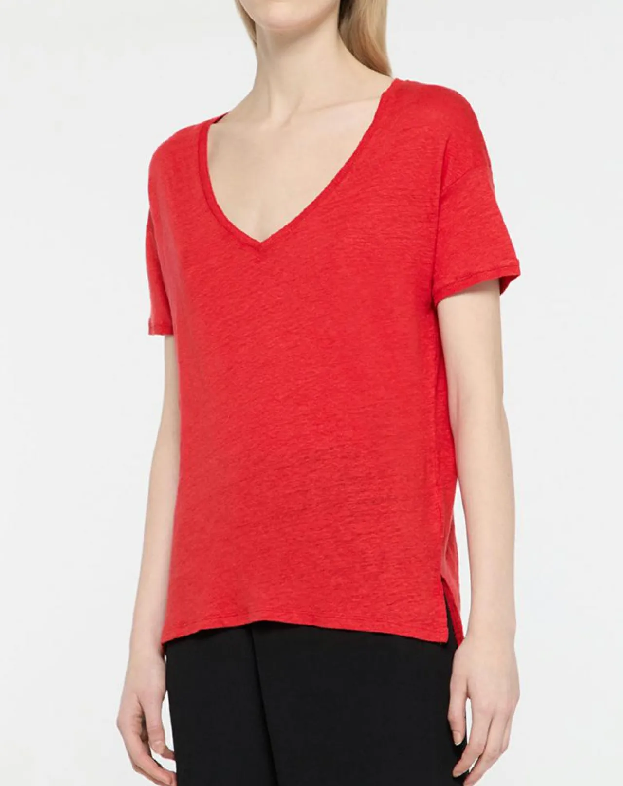 Ce t-shirt droit Yerse en lin est muni du’n col V côtelé comme le bord des manches et d’un ourlet fendu.