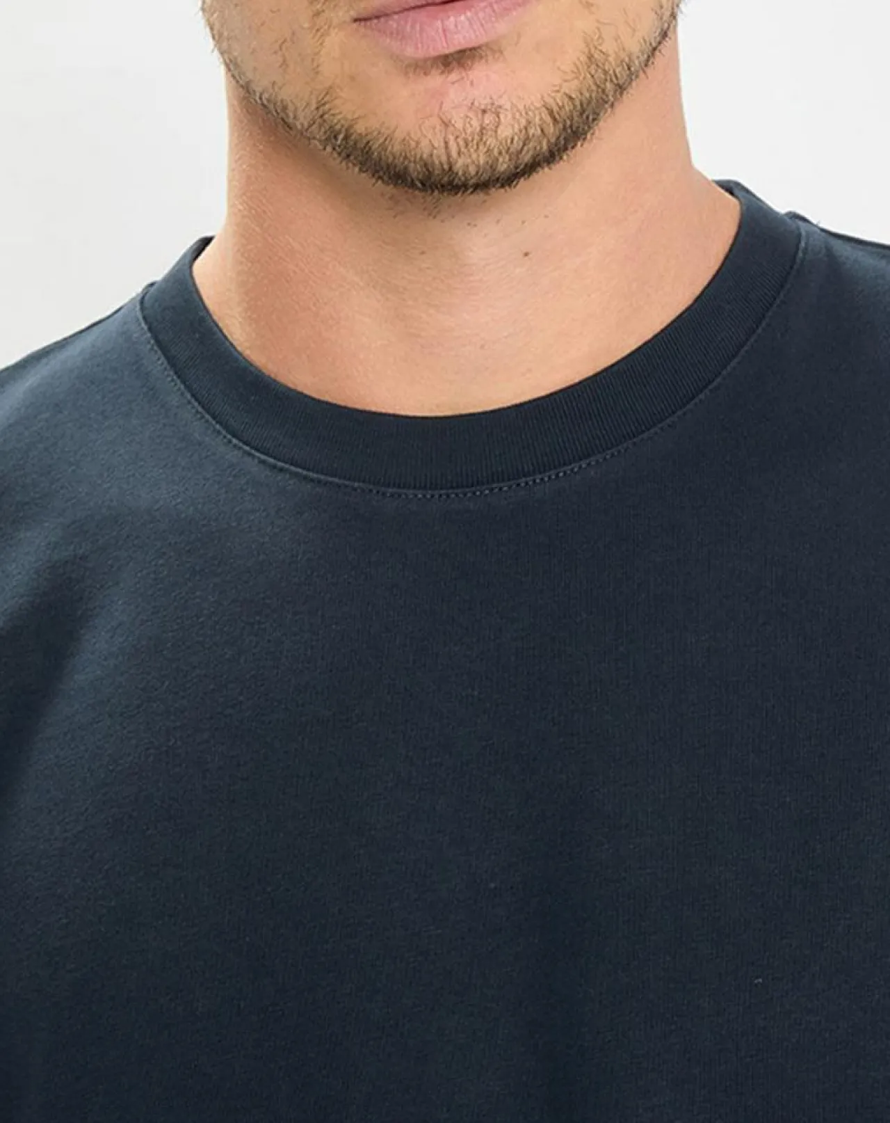 Encolure ronde côtelée classique, base droite et étiquette à l’effigie de la marque discrète sur la couture latérale.