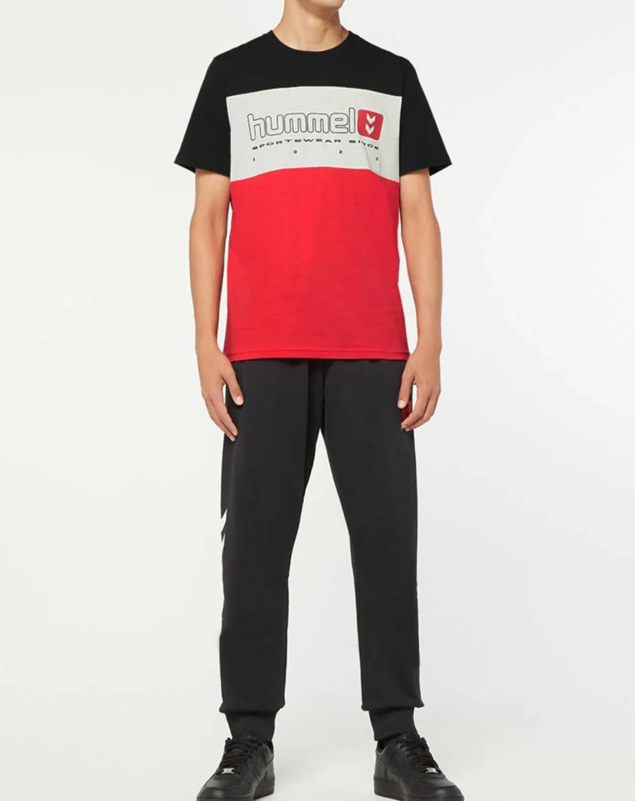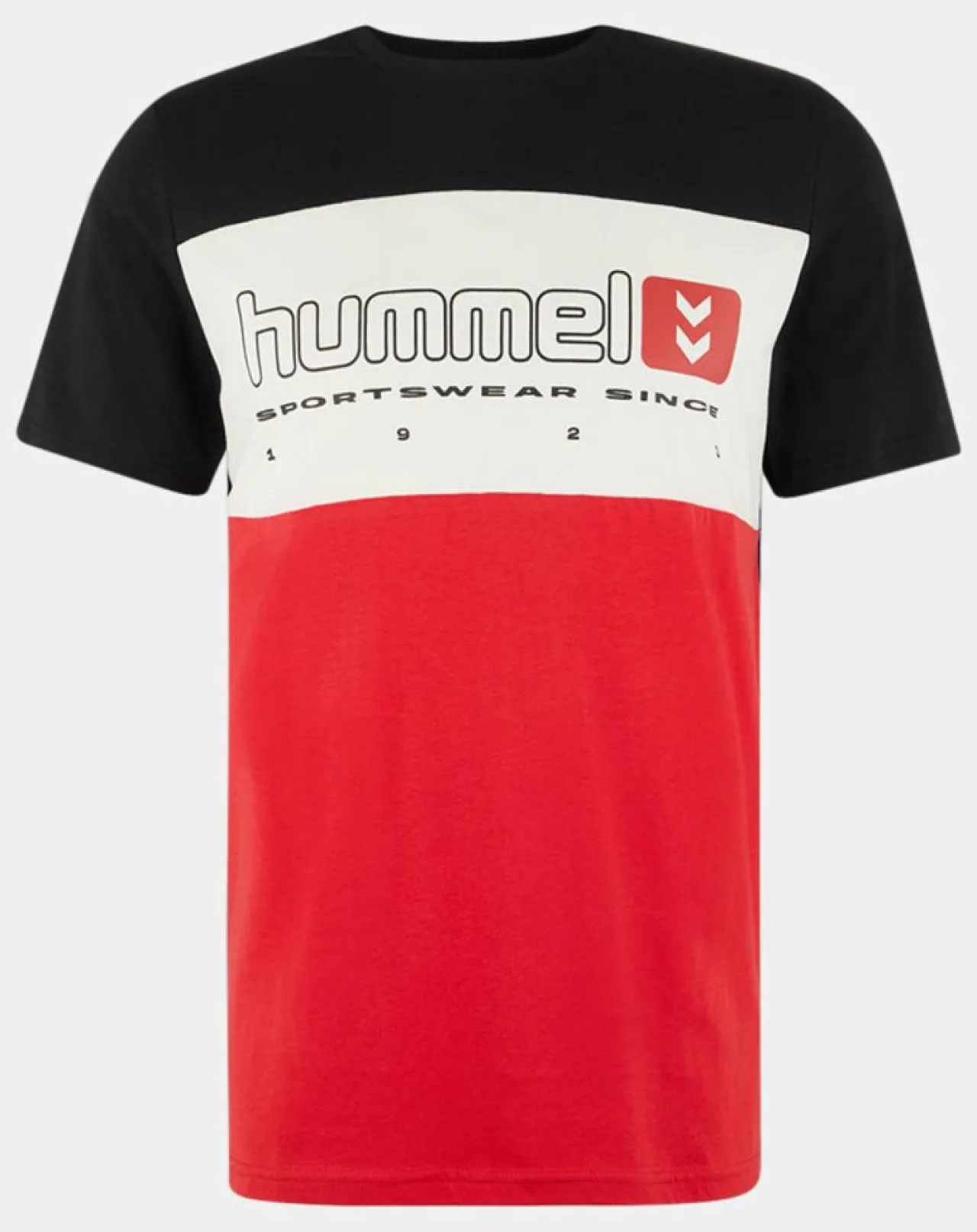 Ce t-shirt droit Hummel en coton tricolore sur l’avant est muni d’un col rond côtelé et de la signature appliquée sur la poitrine.