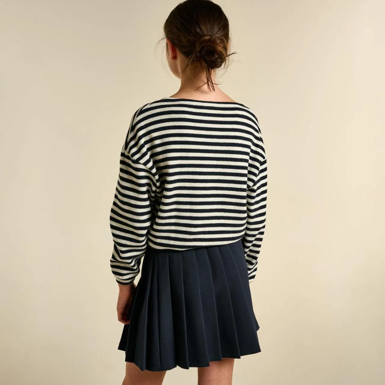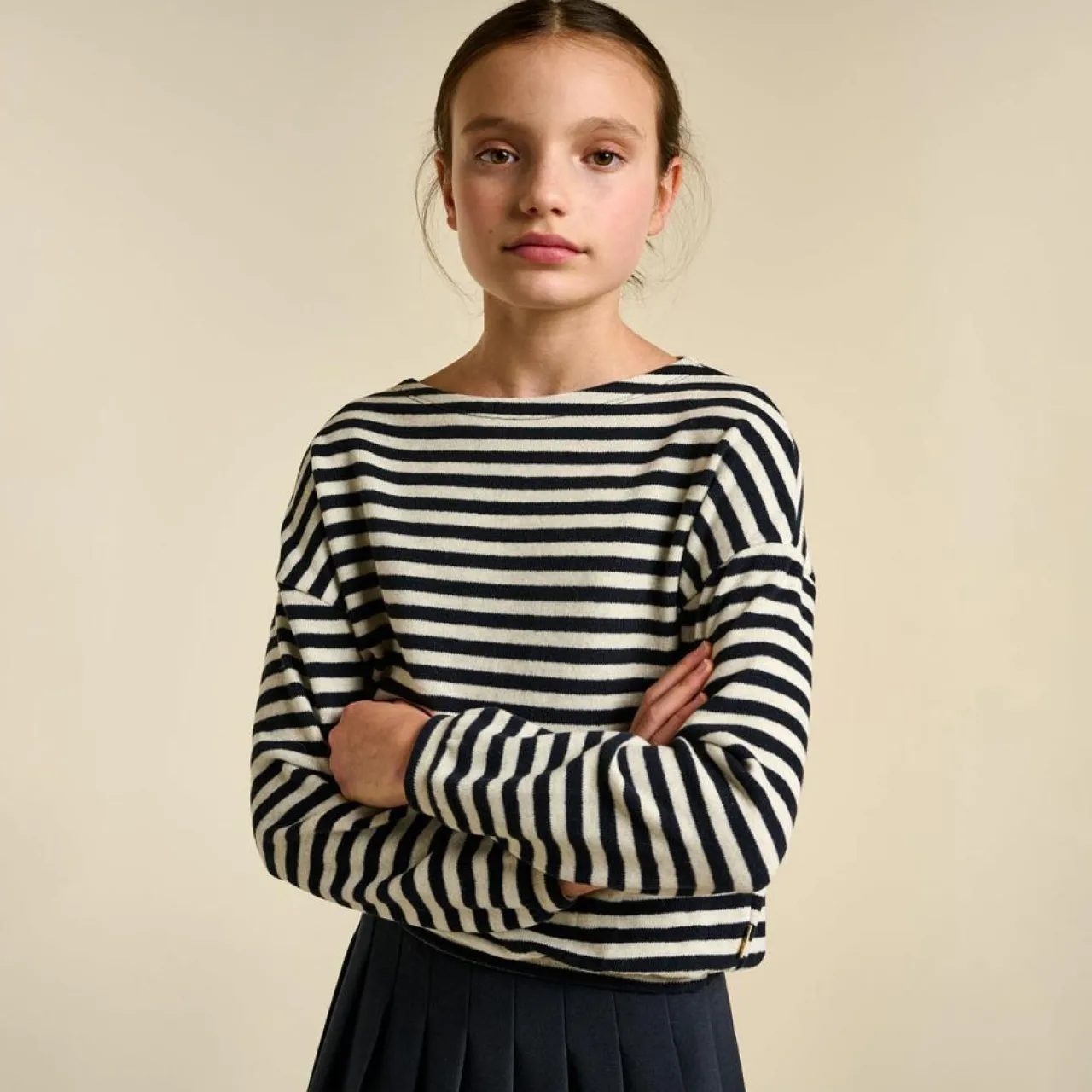 Elle présente une coupe décontractée avec un col bateau et des épaules légèrement tombantes