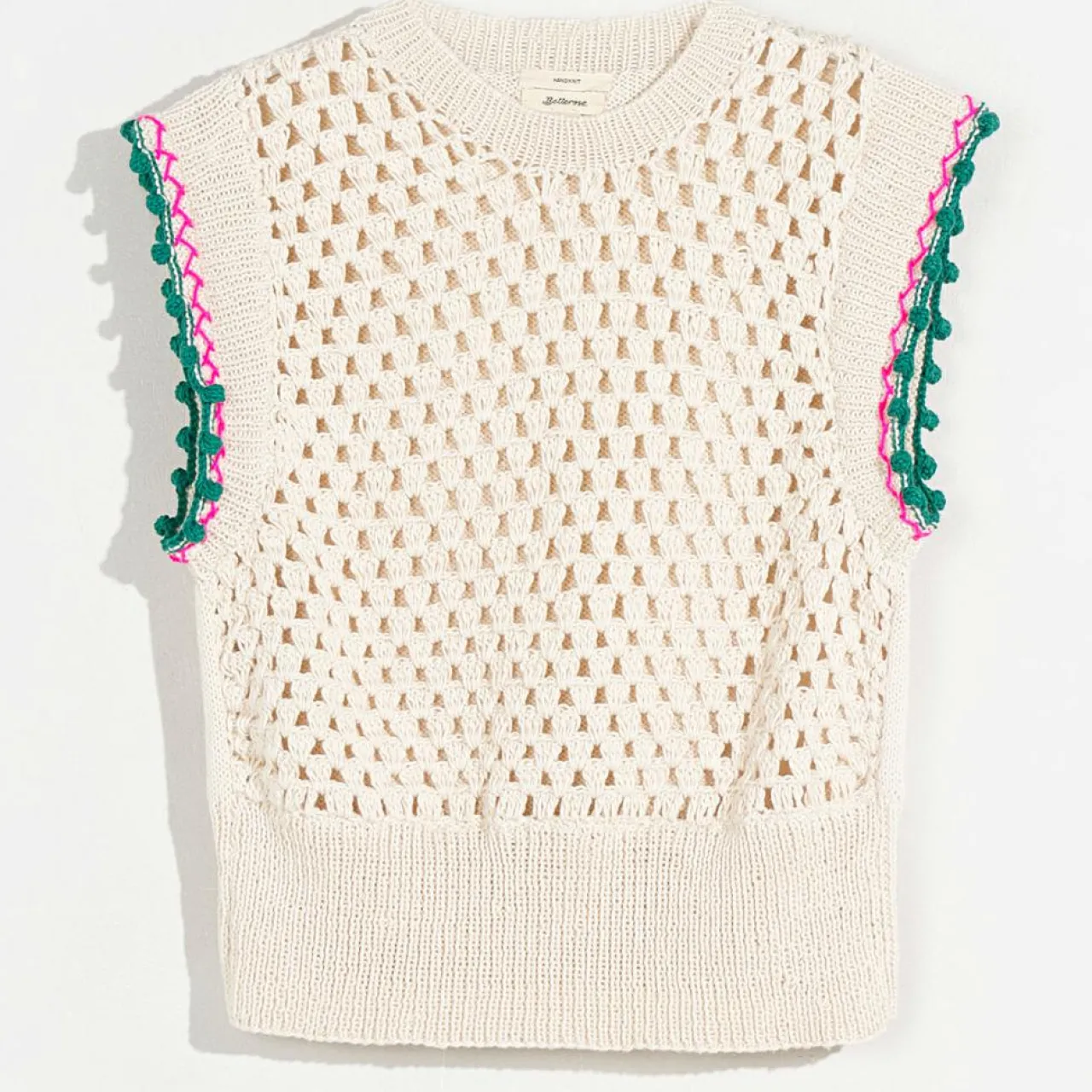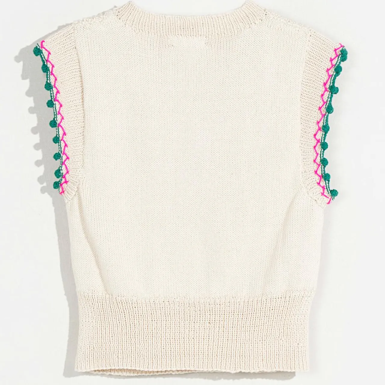 Confectionné à la main par des artisans au Népal, ce top en crochet 100% coton séduit par ses bords contrastés de broderies en zig-zag roses et sa rangée de mini-pompons verts