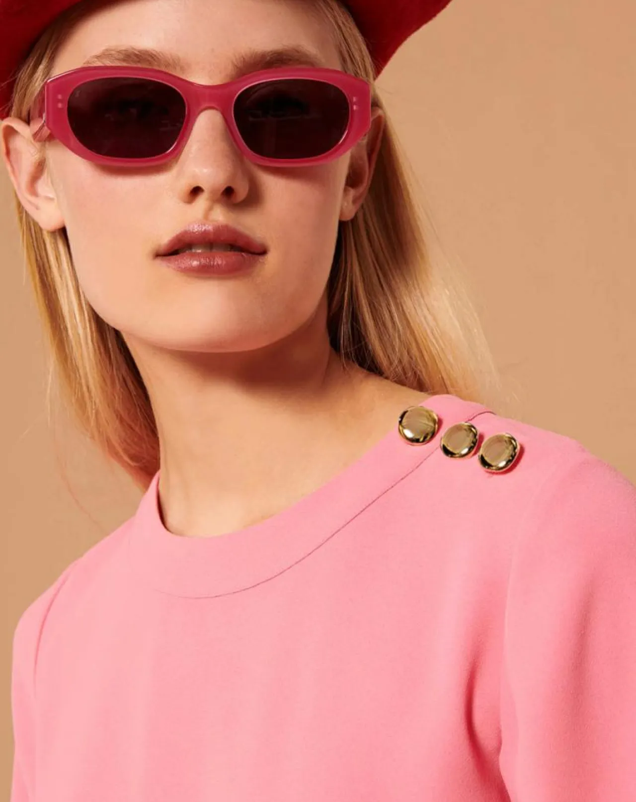 Ce haut couleur rose en crêpe possède des manches courtes évasée et une encolure ronde