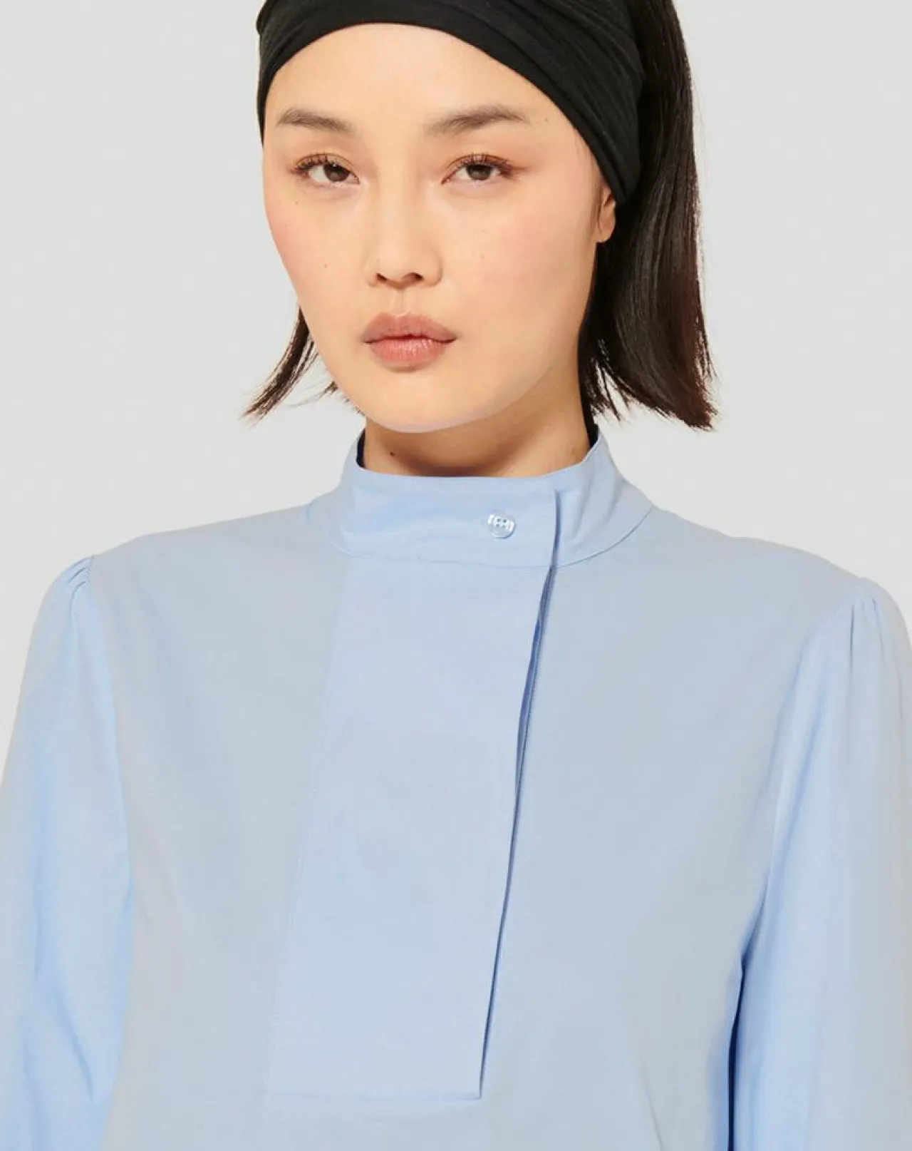 Cette chemise en popeline couleur horizon possède un col montant et des manches longues boutonnées aux poignets par de petits boutons écrus