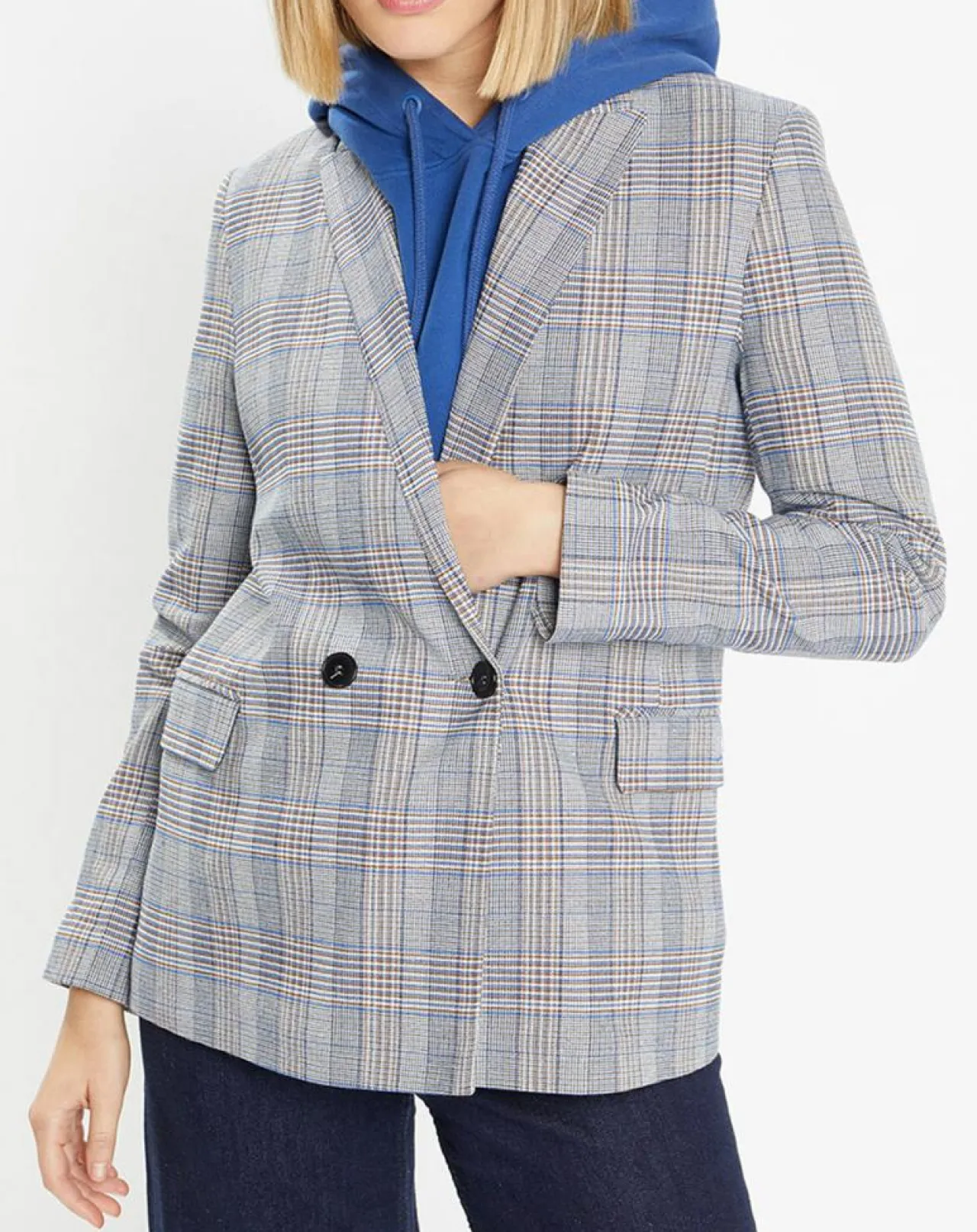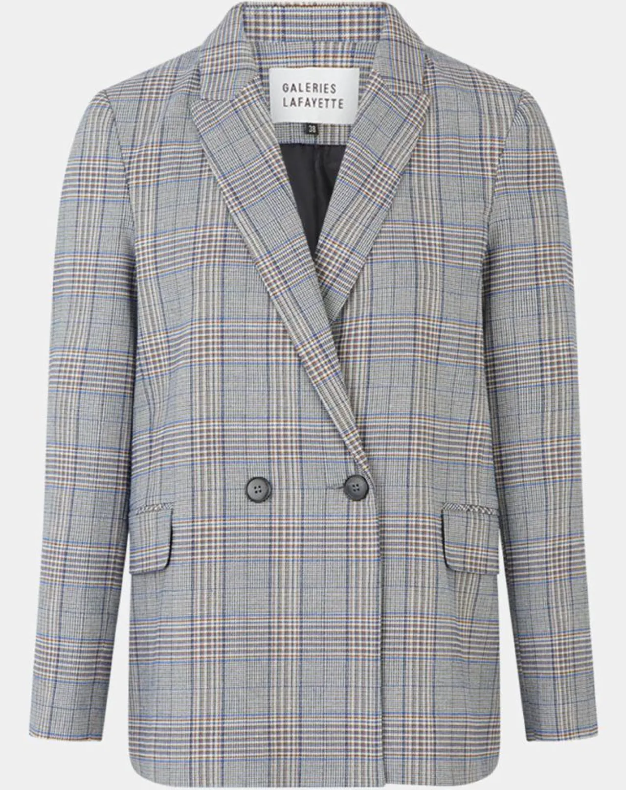 Cette veste blazer droite Galeries Lafayette présente un imprimé prince de galles, un col tailleur, un double boutonnage et des poches.