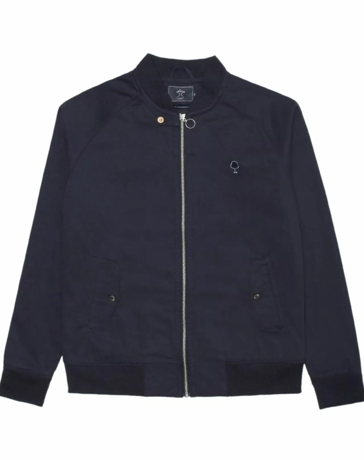 Coupe régular, col teddy et manches raglan pour ce beau blouson HANAU en sergé de coton marine et d’inspiration vintage.
