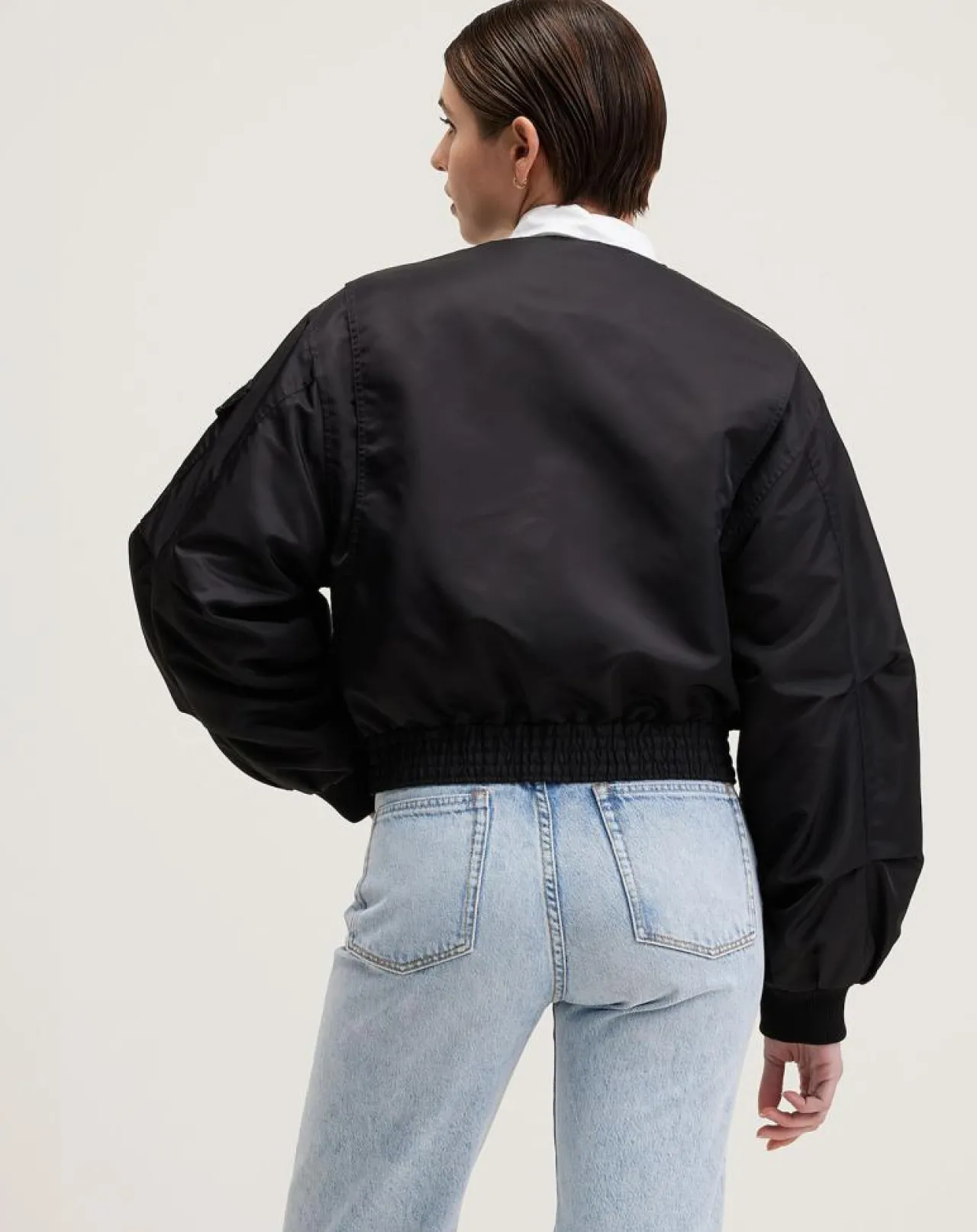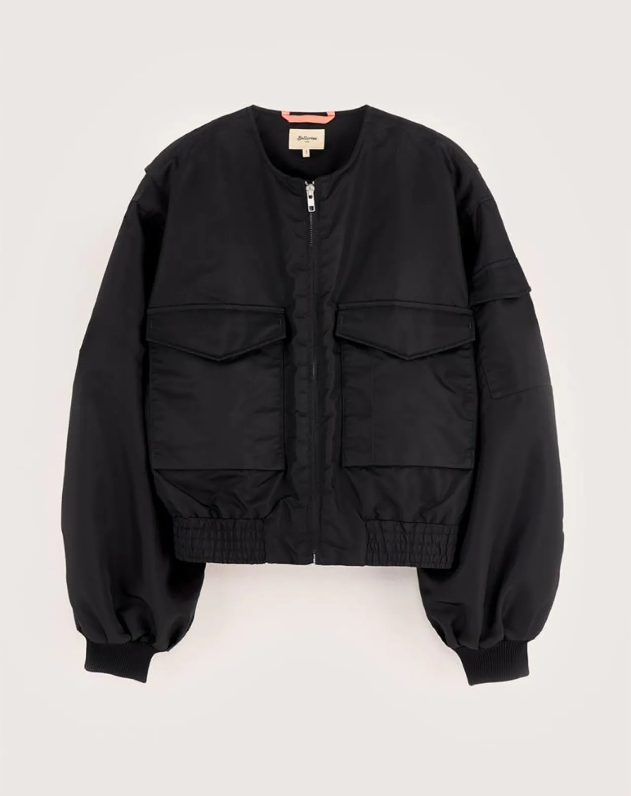 Veste sans col forme pilote en toile off black avec fermeture par zip argenté