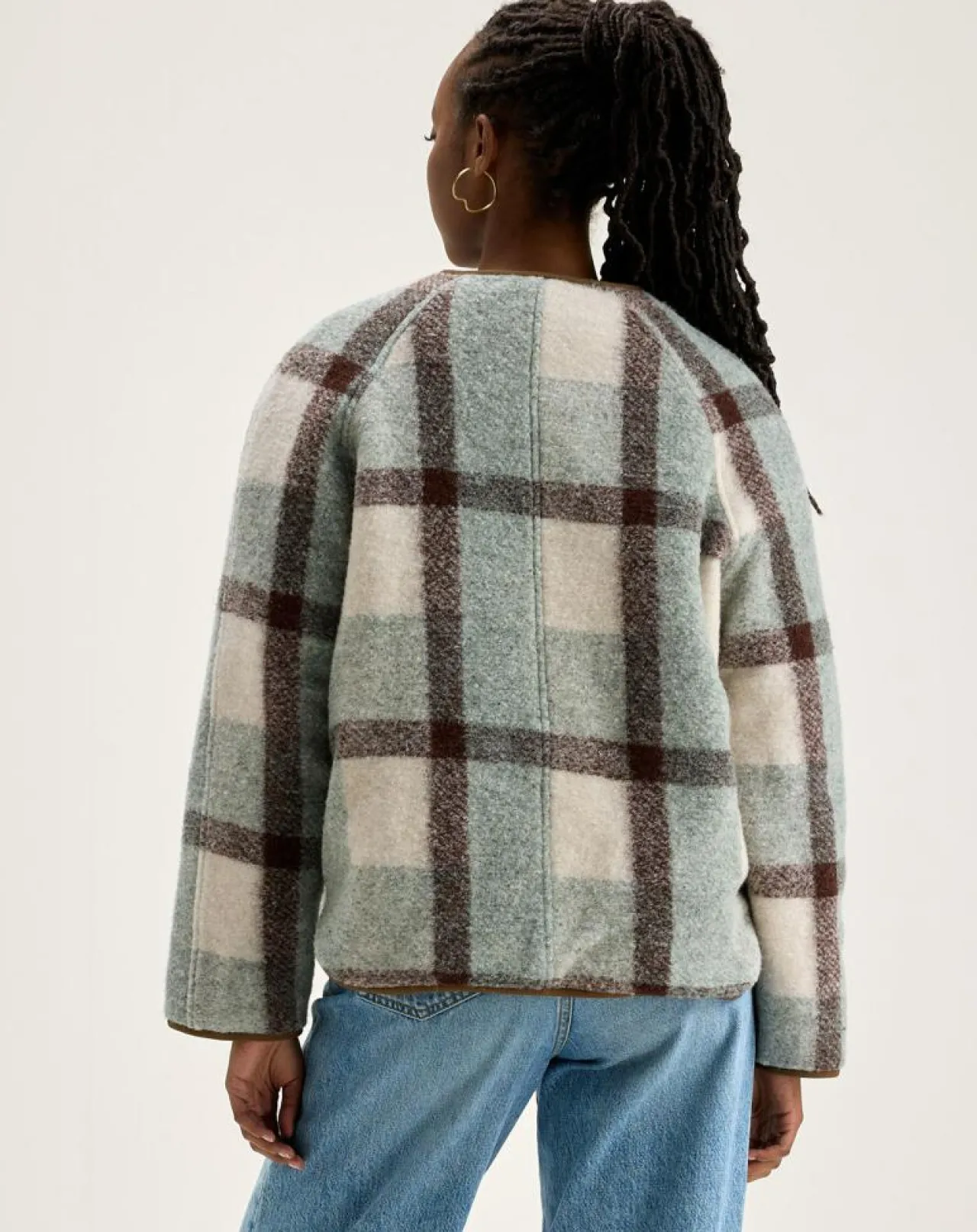 Veste oversize réversible à manches raglan, un côté en ripstop vieux rose et un côté en laine mélangée à carreaux